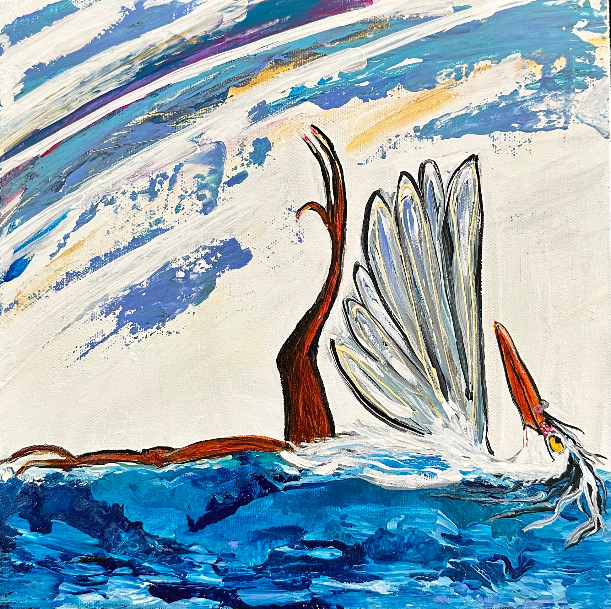 Since always, every time I swim in the sea or in a lake, I have to do my ballet leg, (synchronized swimming figure). I HAD to create a swimming heron! Notice its feathers floating on the surface, but above all...its NOSE PIN!