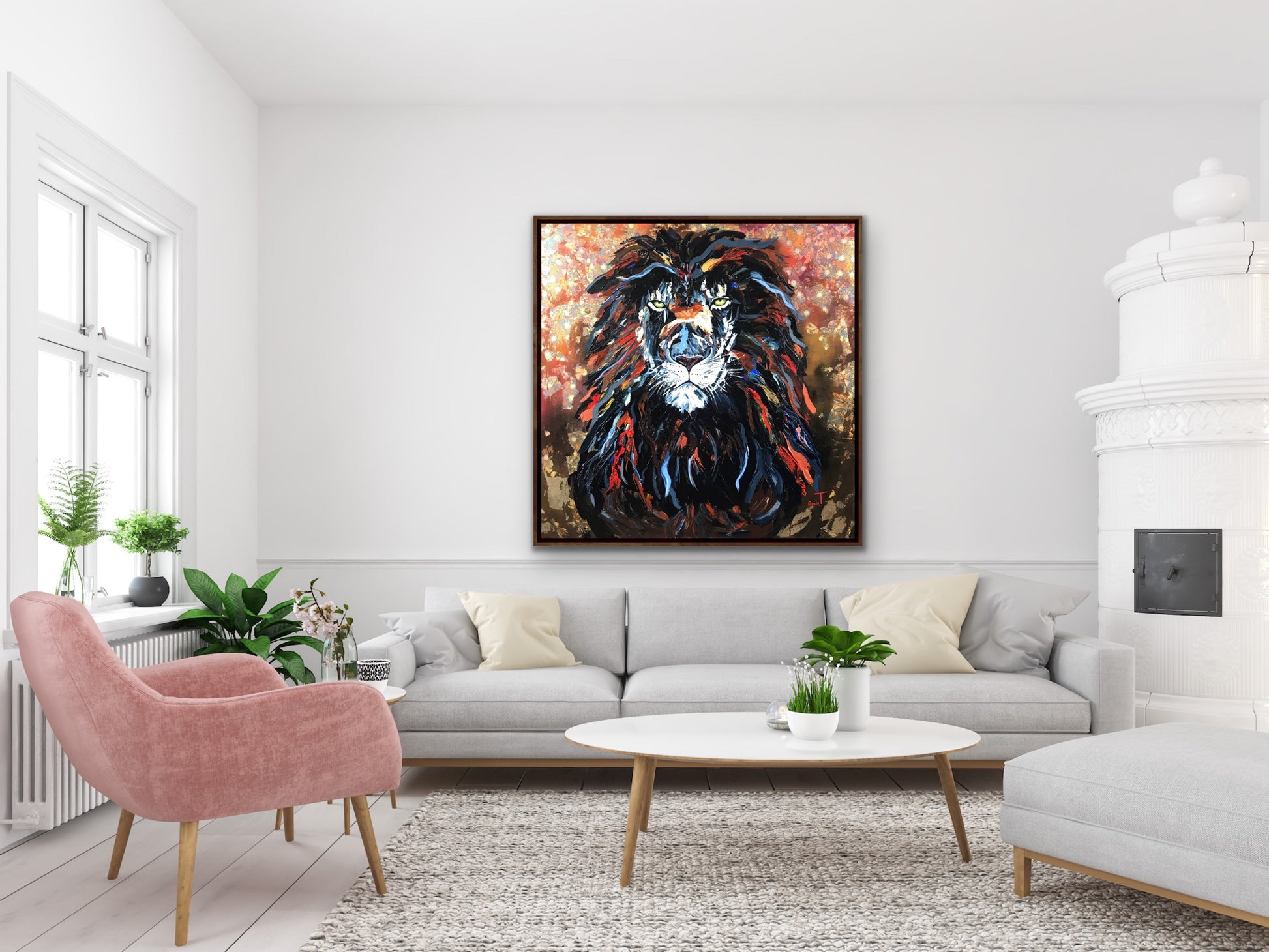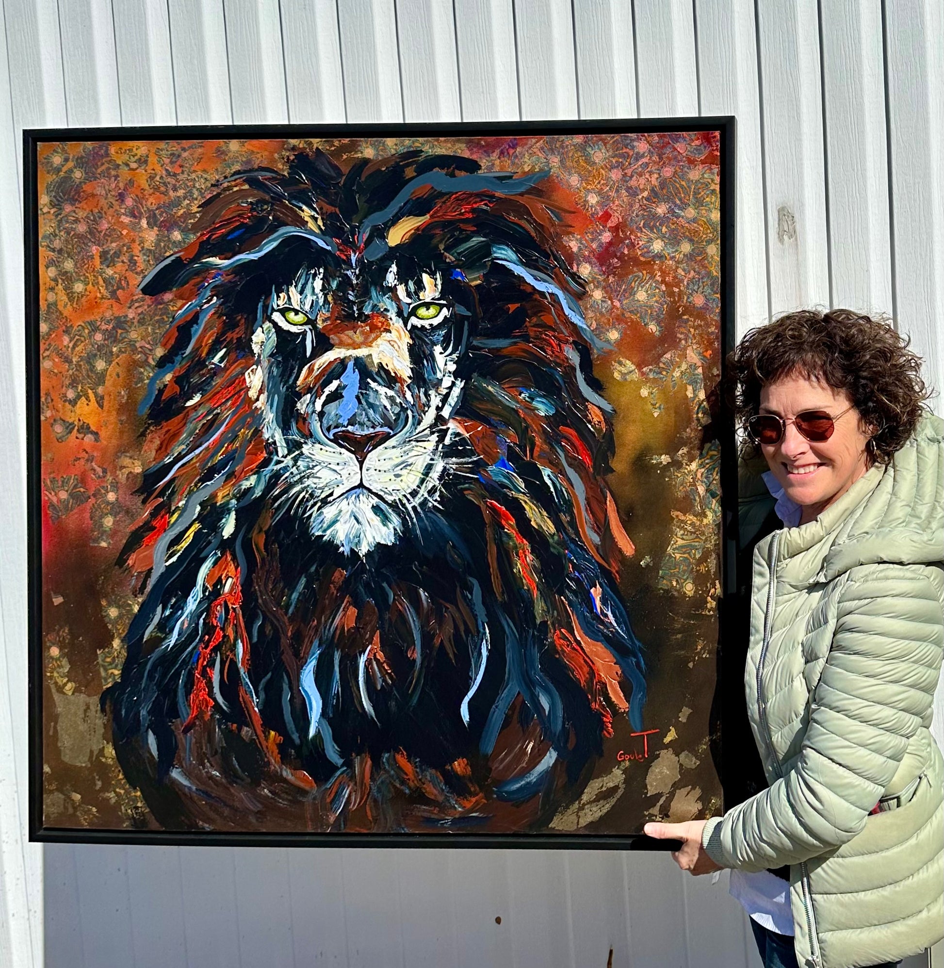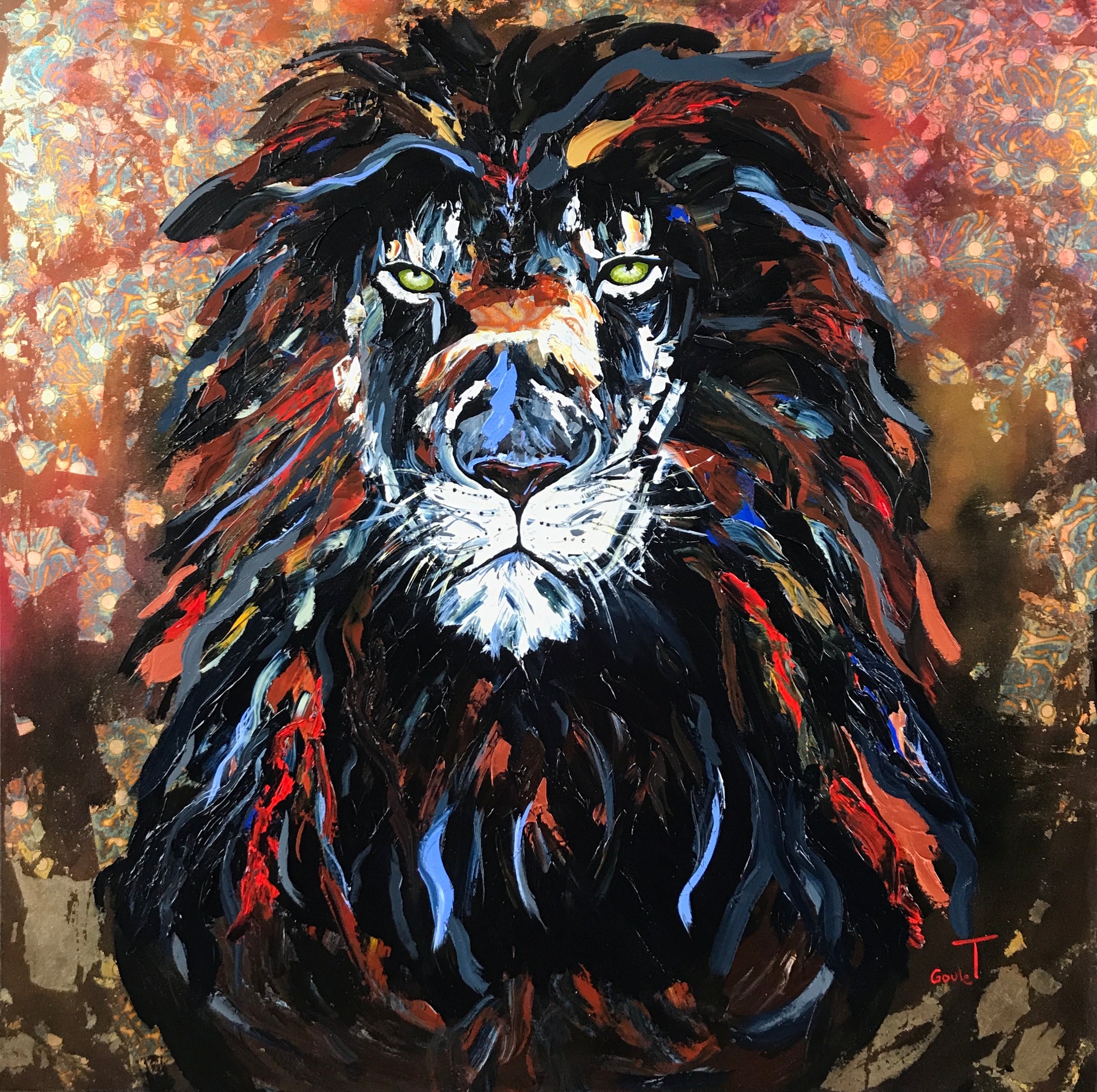 On the background of this work, I applied Italian metallic leaves, which I then worked with acrylic paint, in transparency. Thanks to these variegated leaves, the canvas has brilliant reflections which vary and illuminate the work, depending on the ambient light.