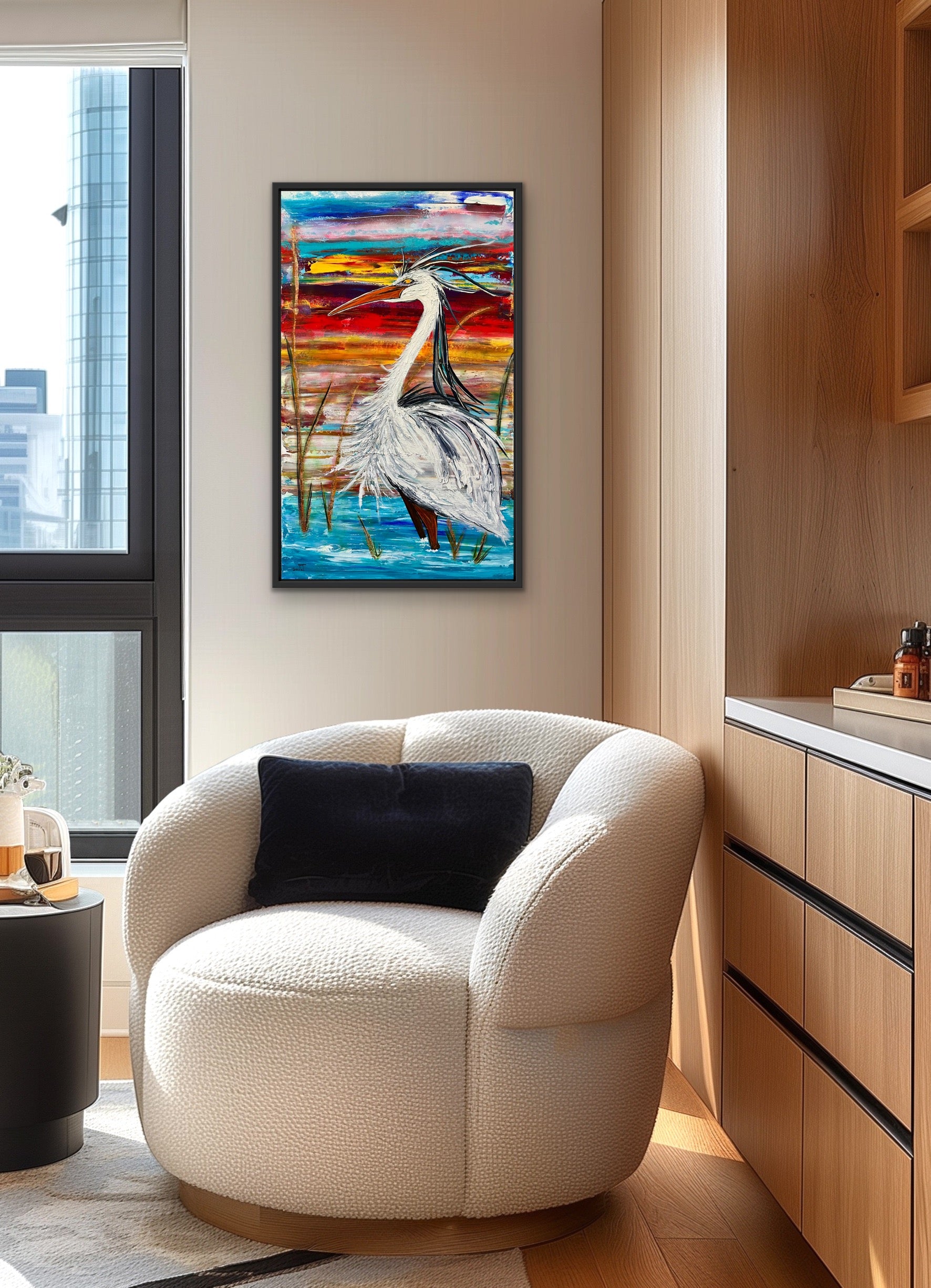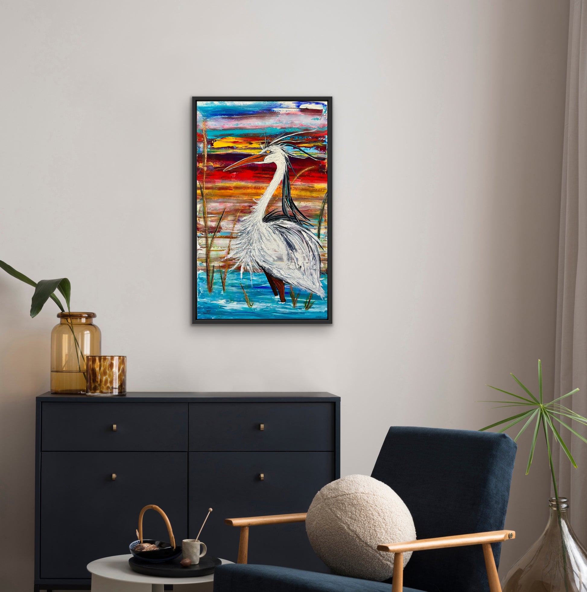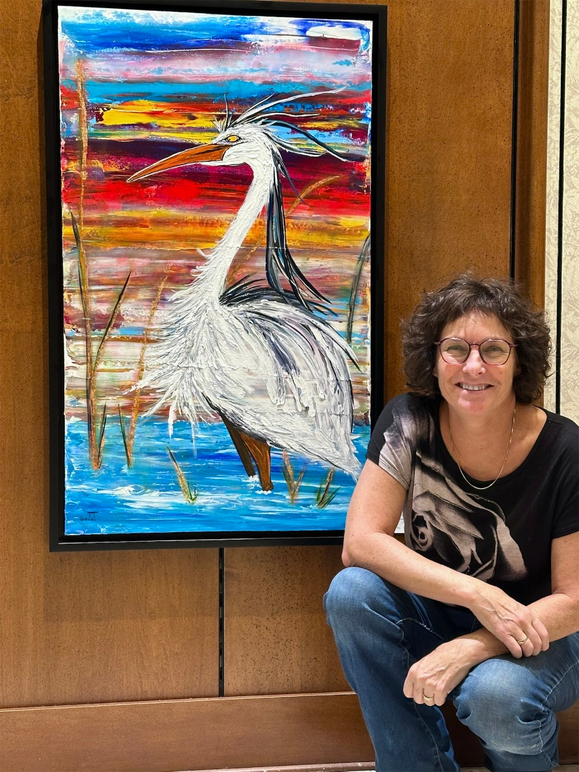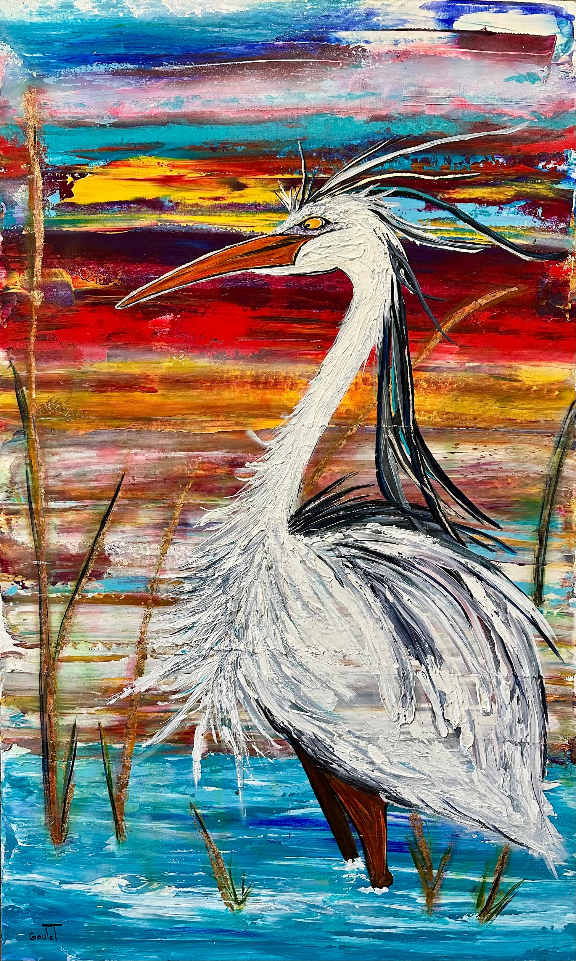 Cette oeuvre me rend heureuse. Elle est directement inspirée des couchers de soleil au chalet, sur le bord du lac, à admirer les hérons majestueux.