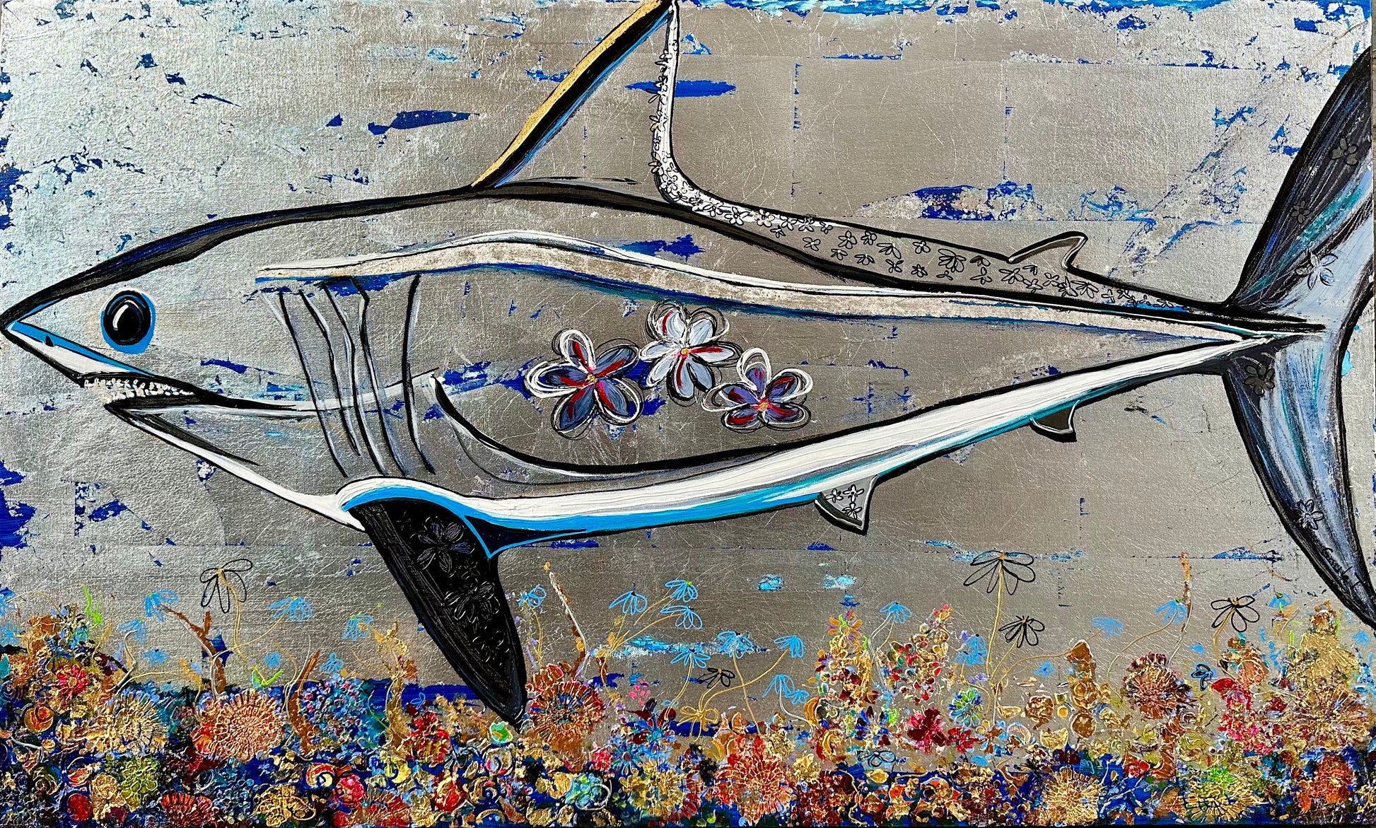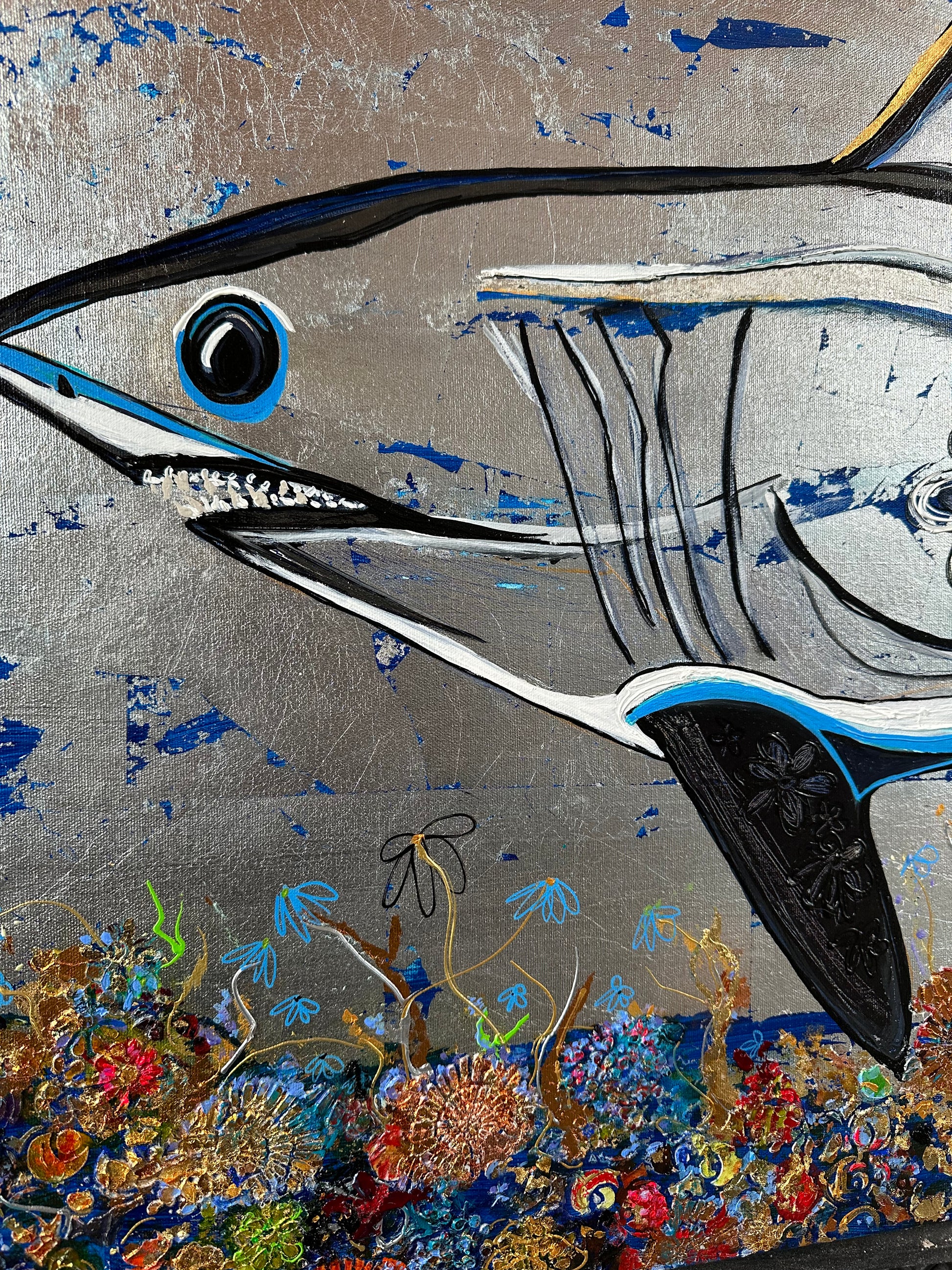 Le fond est fait de feuilles d’aluminium, et une bande de feuilles d’argent pur orne le dos du requin. L’aileron est liséré de feuilles d’or 23k. Le corail est texturé de mortier léger et de feuilles métalliques dorées, bronze, et à motifs.
