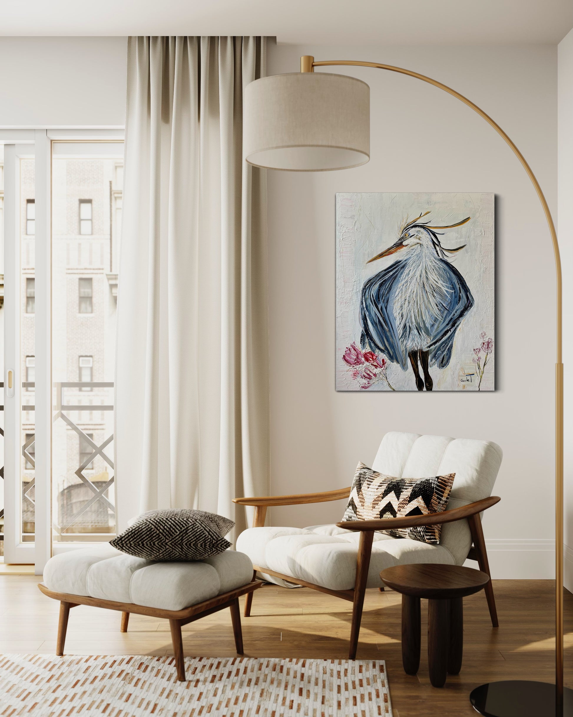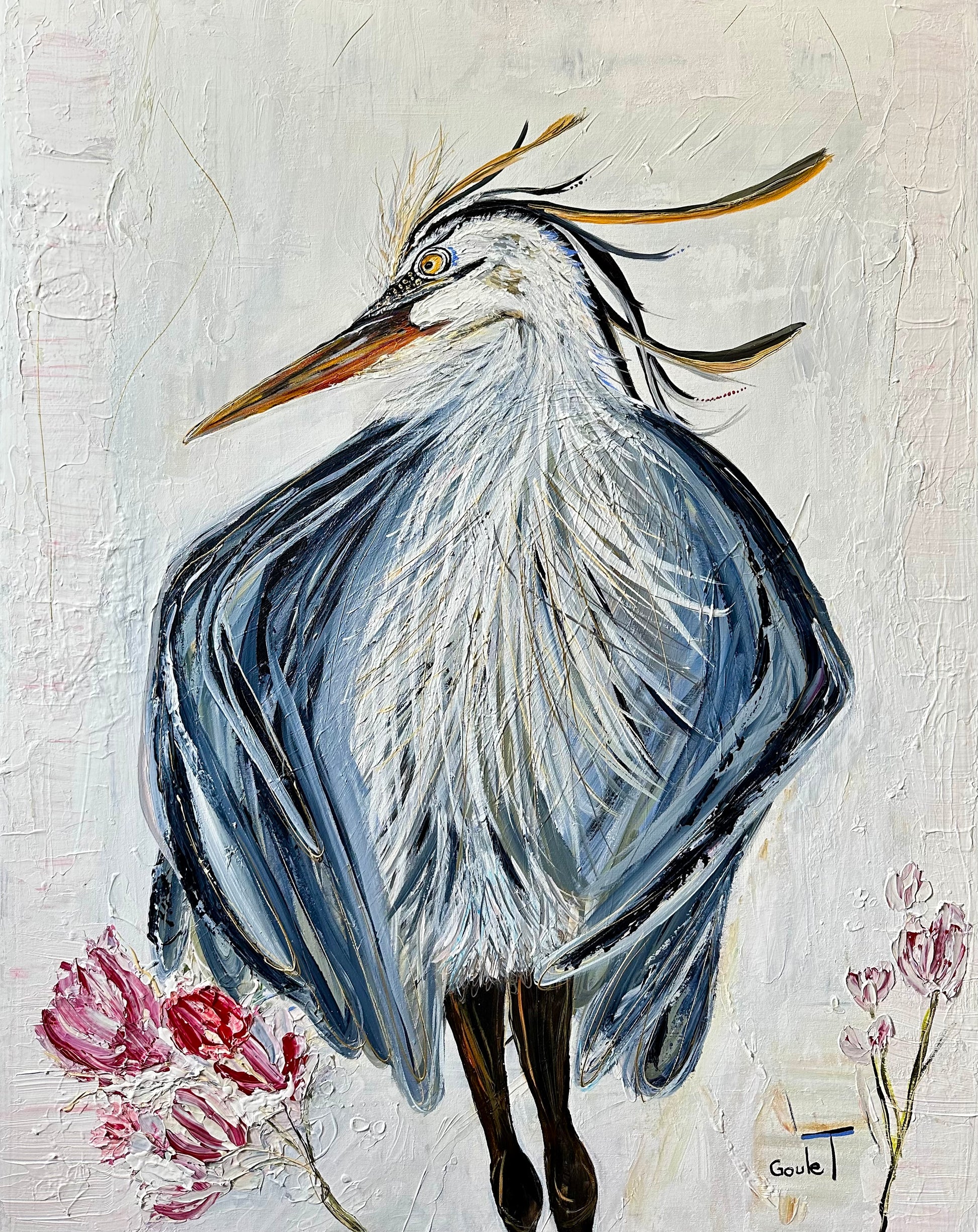 La taille de cette oeuvre lui assure une belle présence dans une pièce, sans rien concéder sur la douceur et la gaieté qui émanent de la toile.