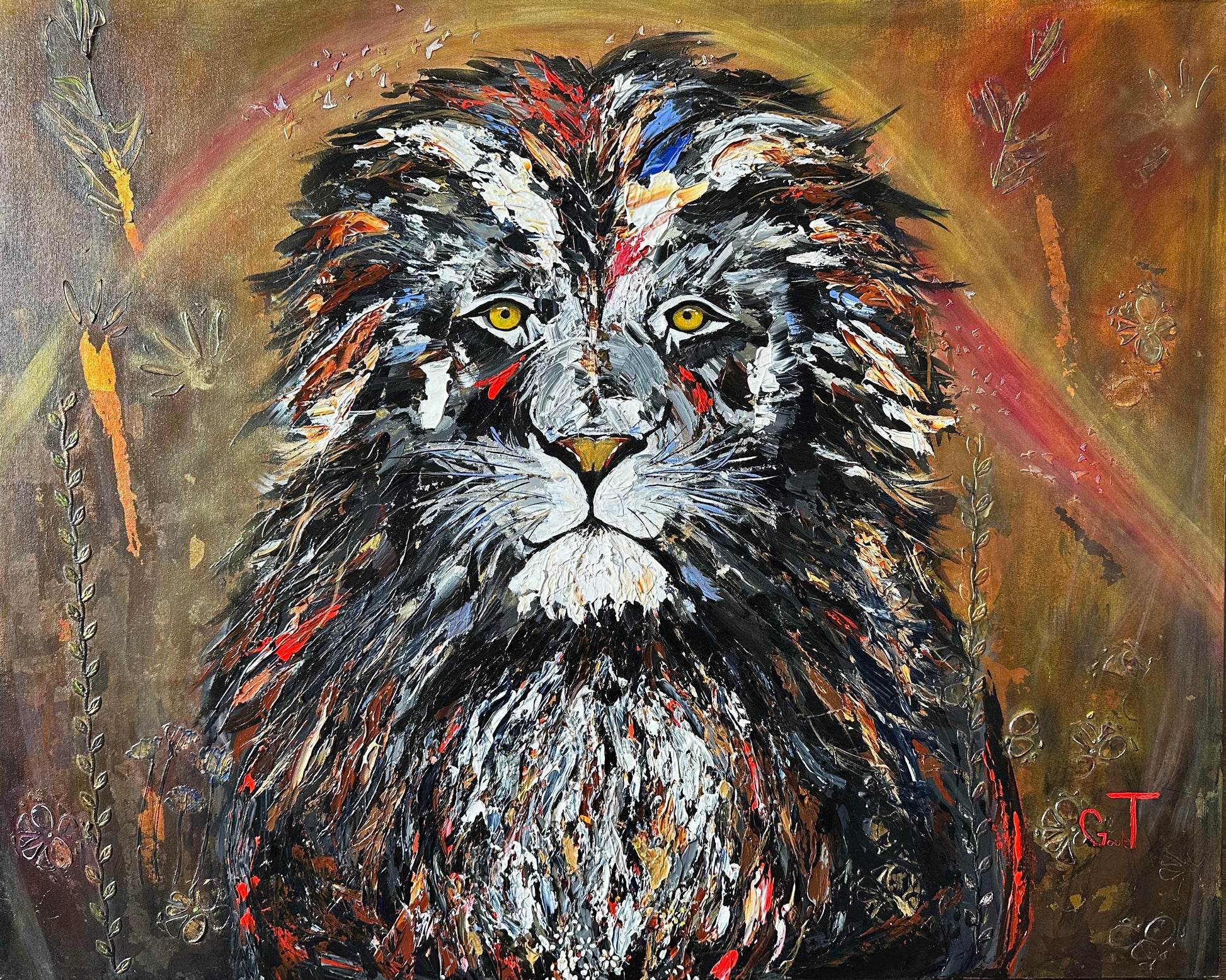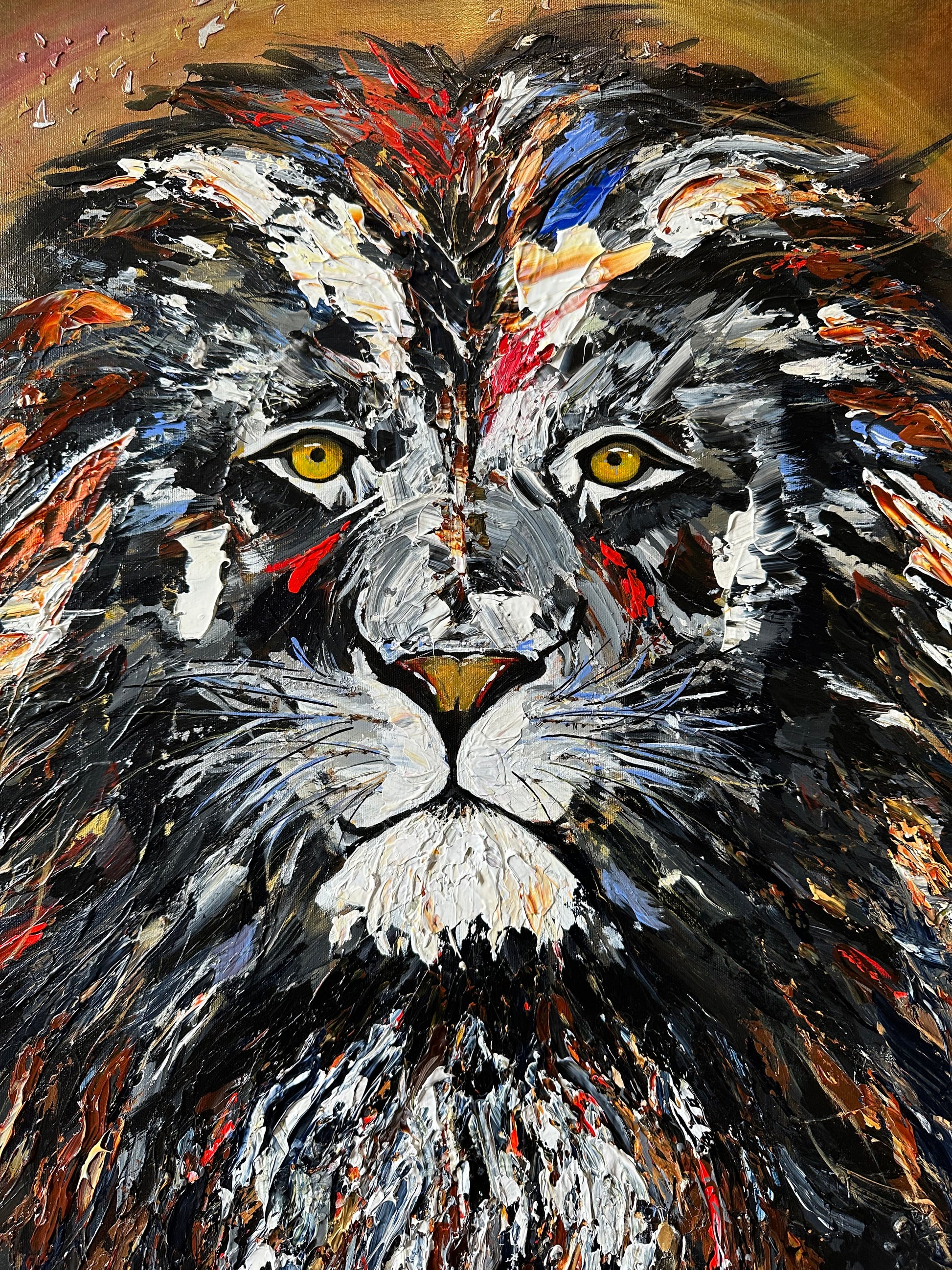 La crinière et la fourrure du lion sont particulièrement texturées.