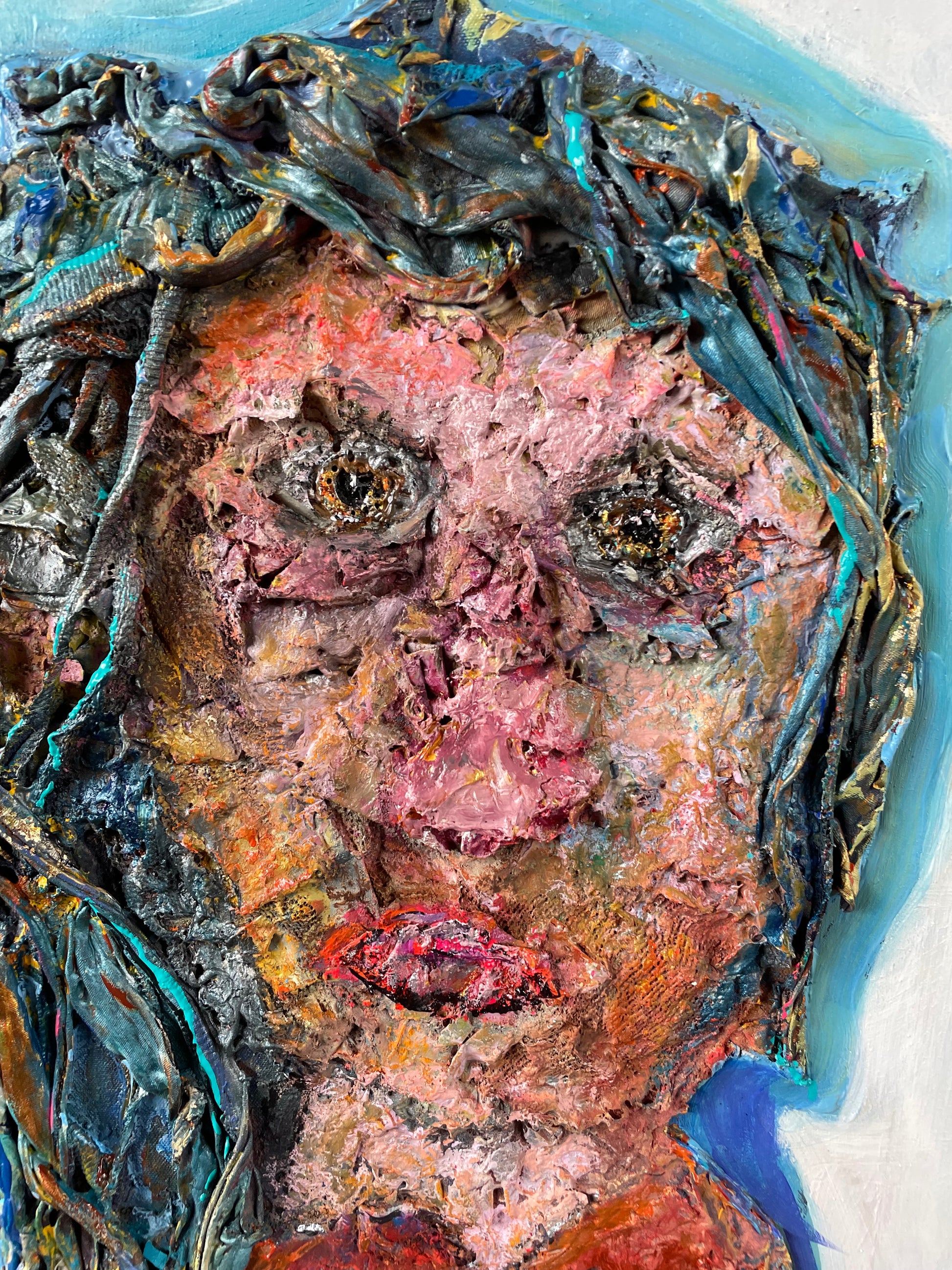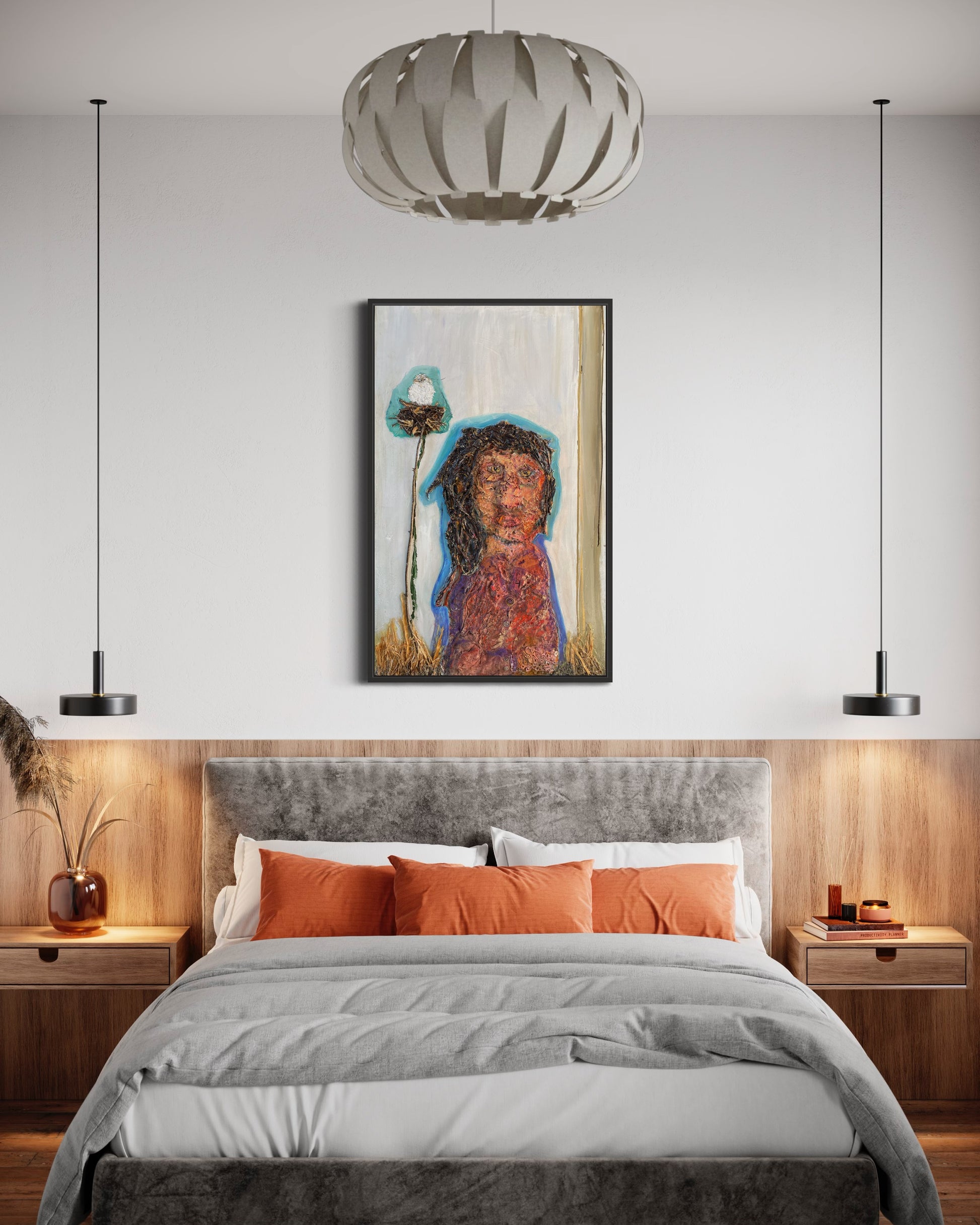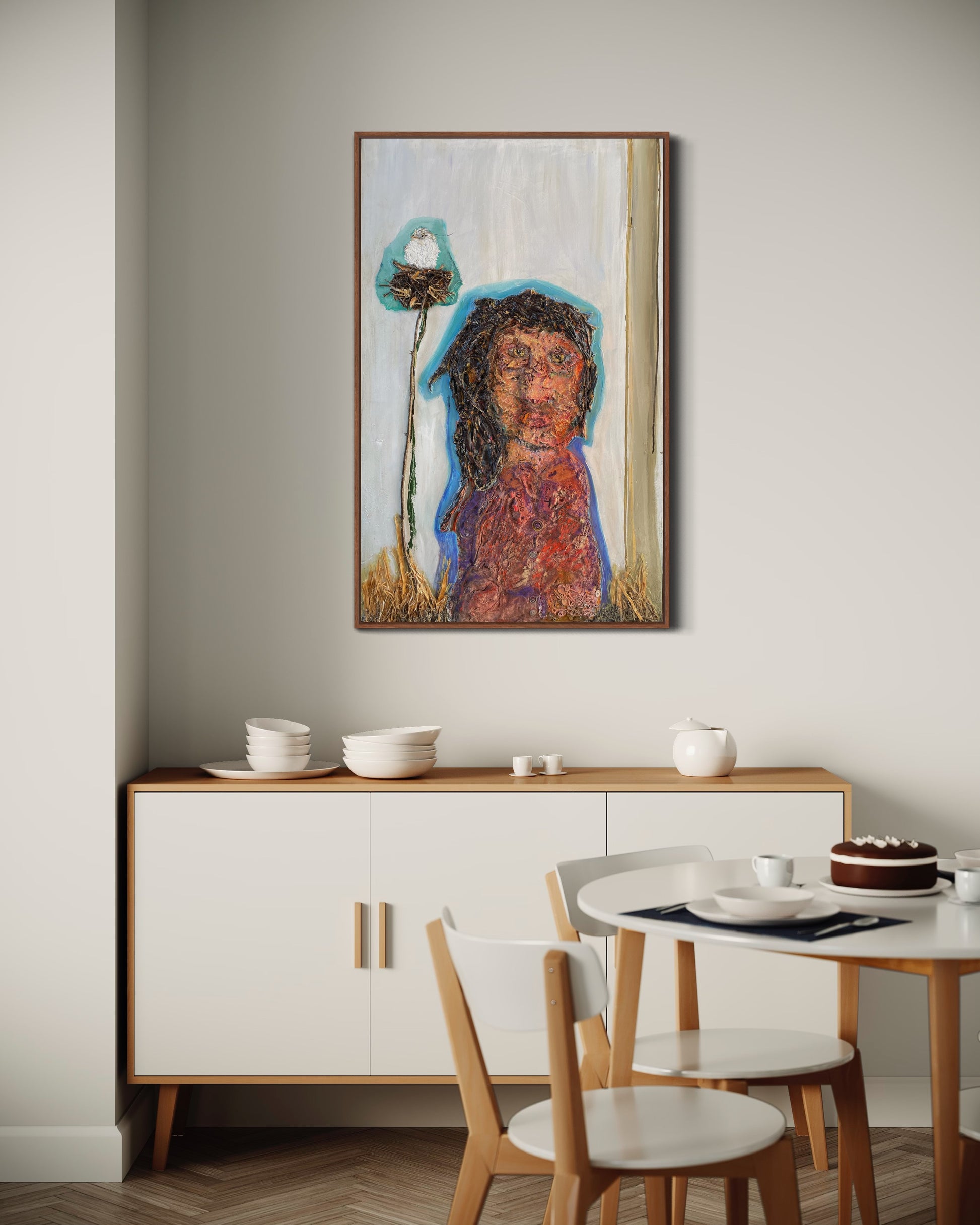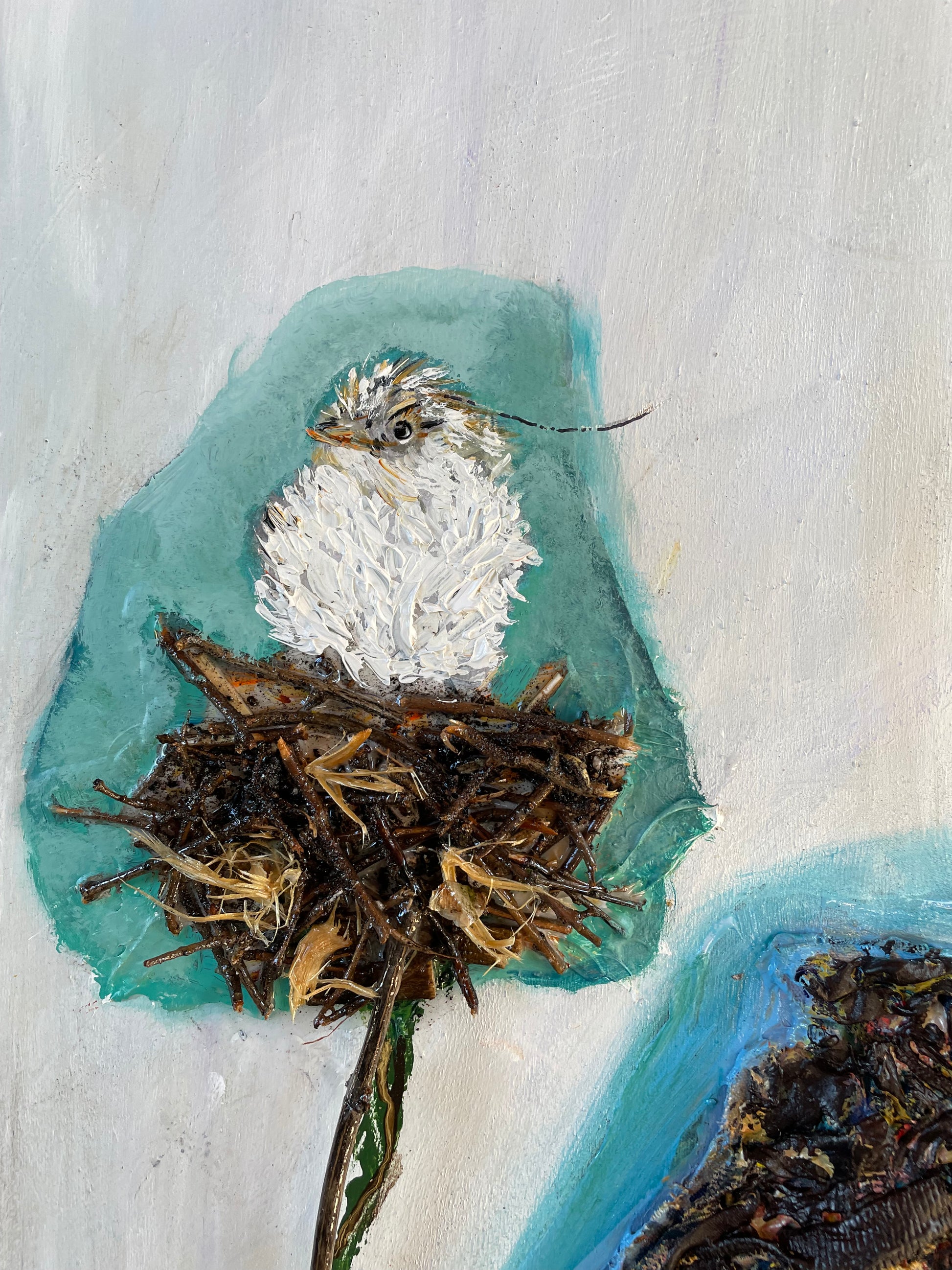 On reconnaît bien le travail unique de Deso qui a créé la femme, et travaillé les herbes et le nid. On devine que Marie-Claude a peint l’oiseau et a aussi travaillé la composition, le fond, et l’ensemble de la toile.