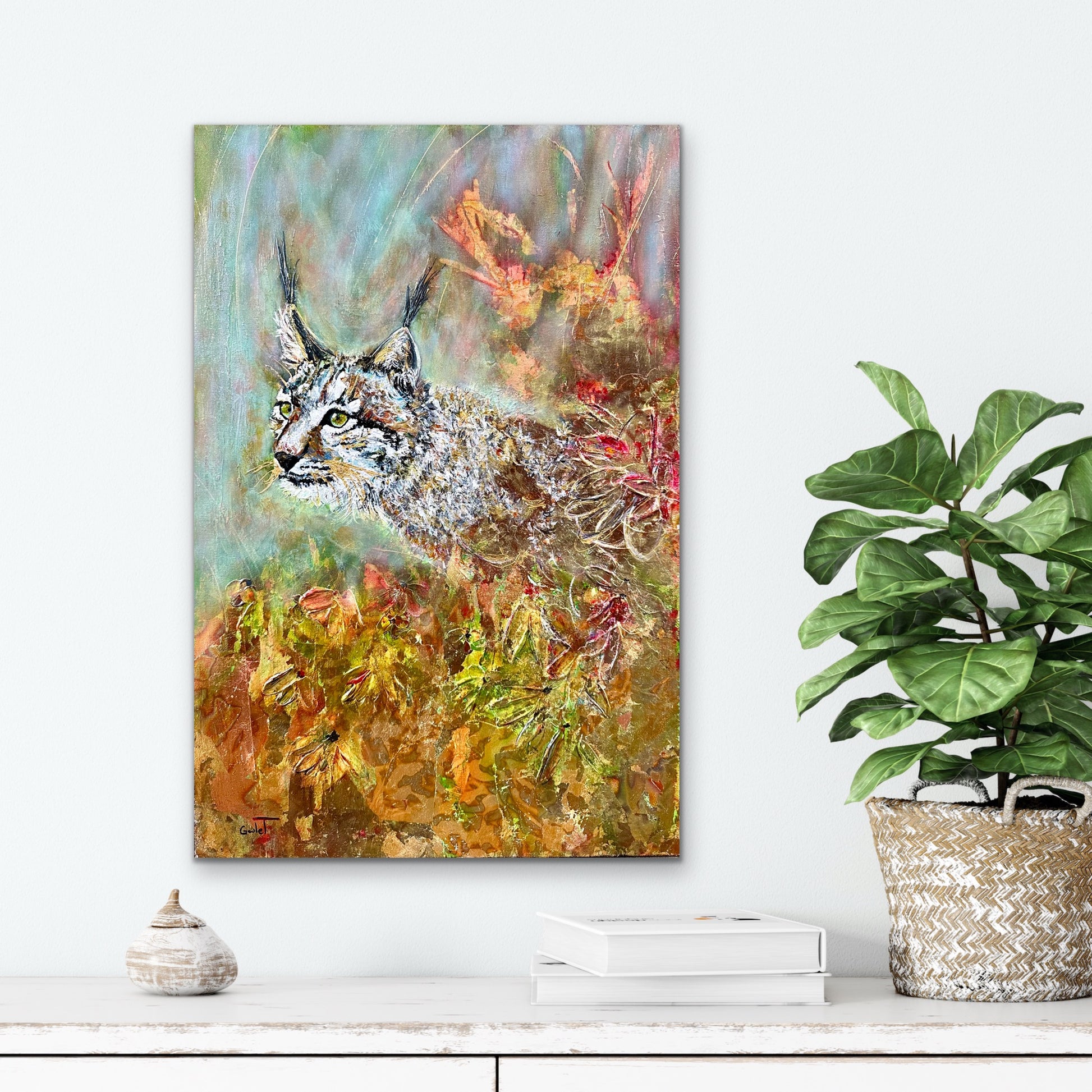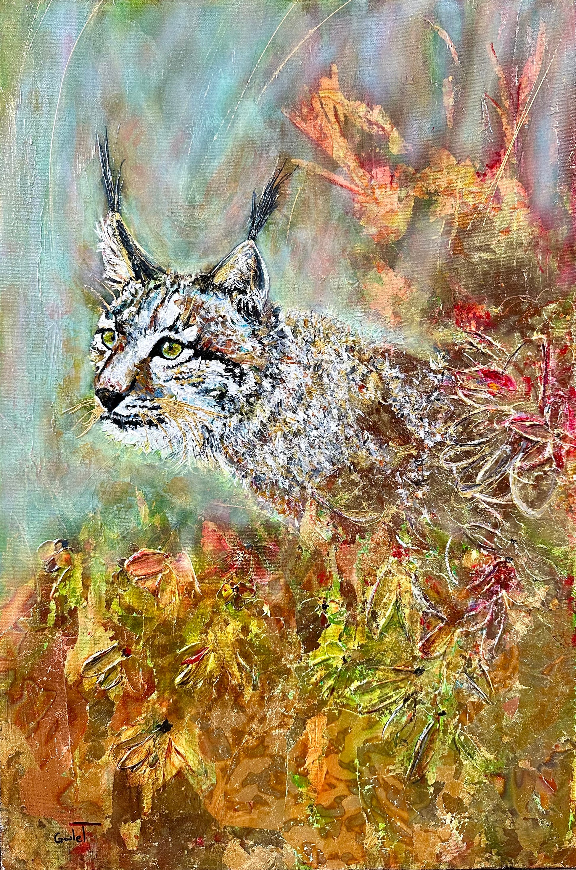 Techniques mixtes sur toile, incluant feuilles d’or 23k.