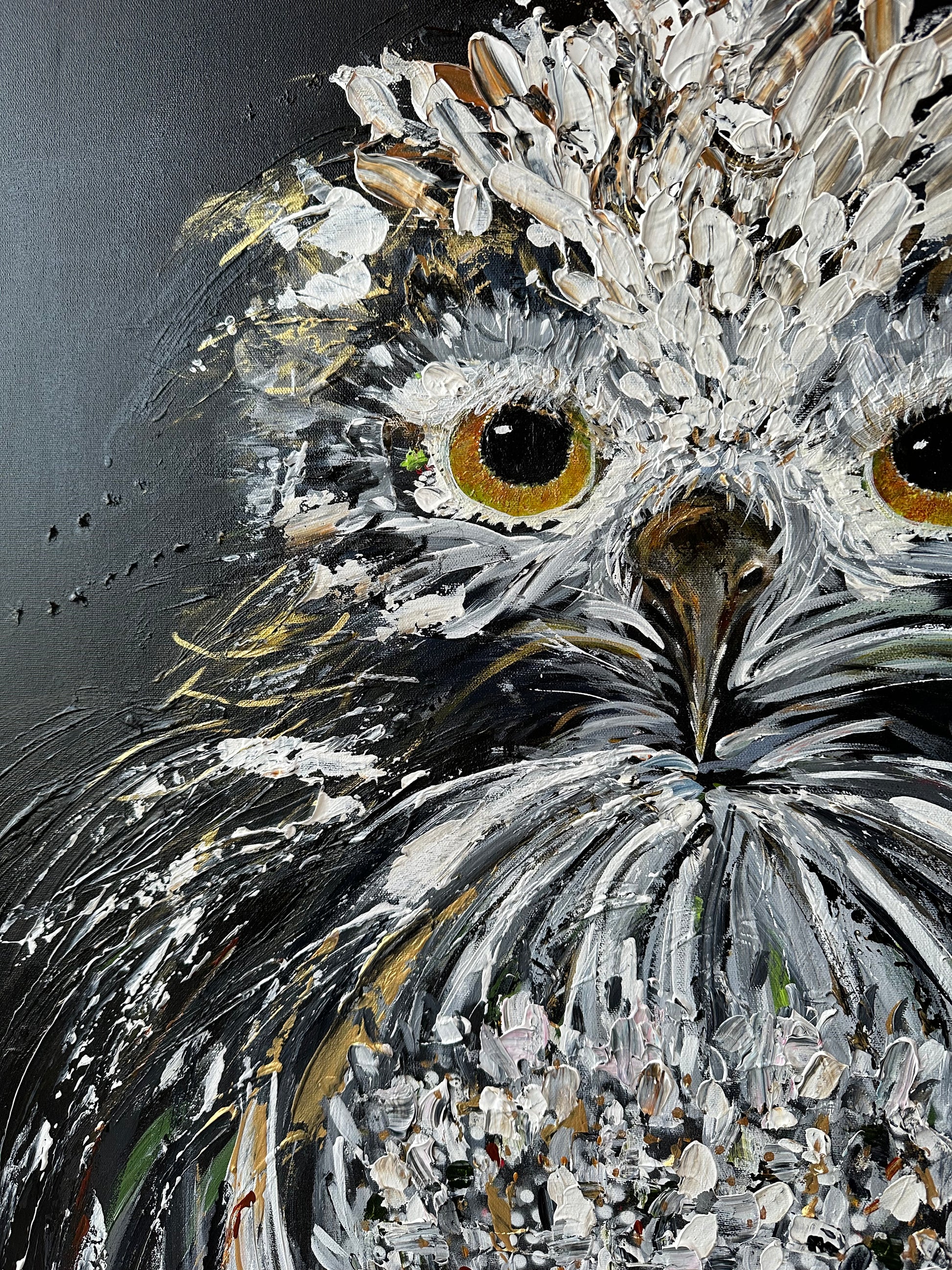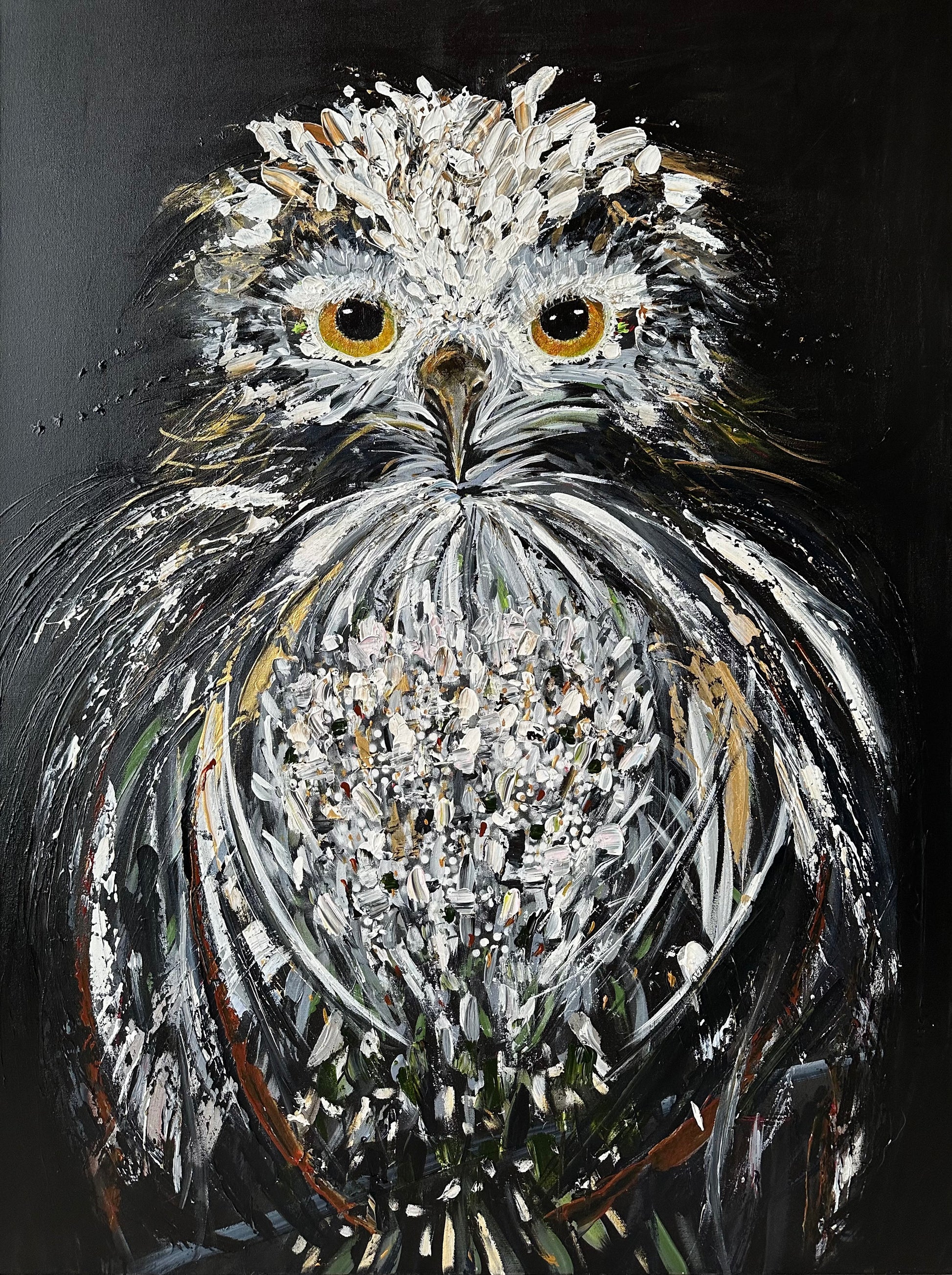 J’ai travaillé cette oeuvre à la spatule, avec le geste libre et ample, ce qui explique la texture épaisse et expressive de ses plumes.