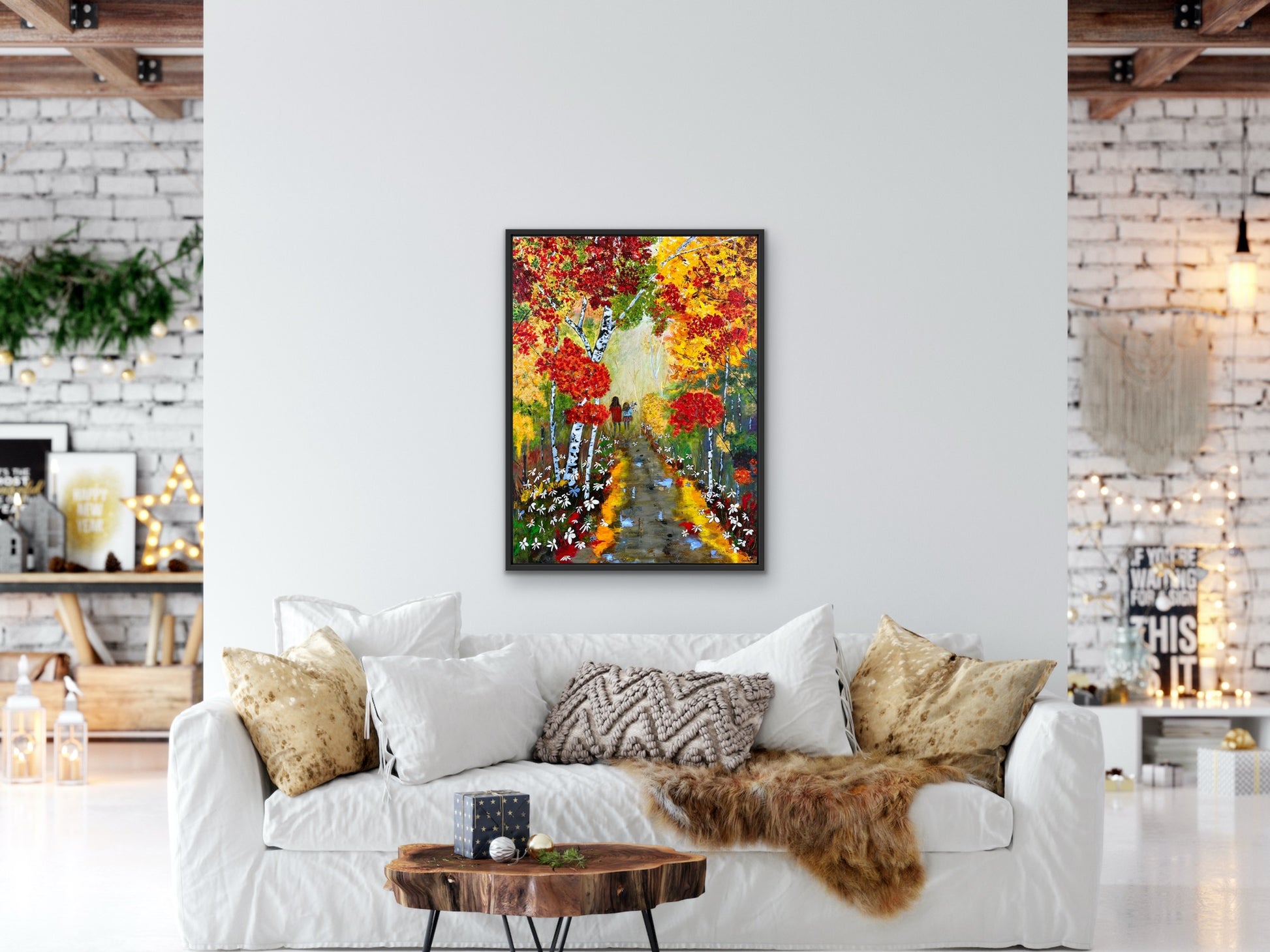 Techniques mixtes sur toile. L’encadrement actuel est offert (moulure flottante noire).