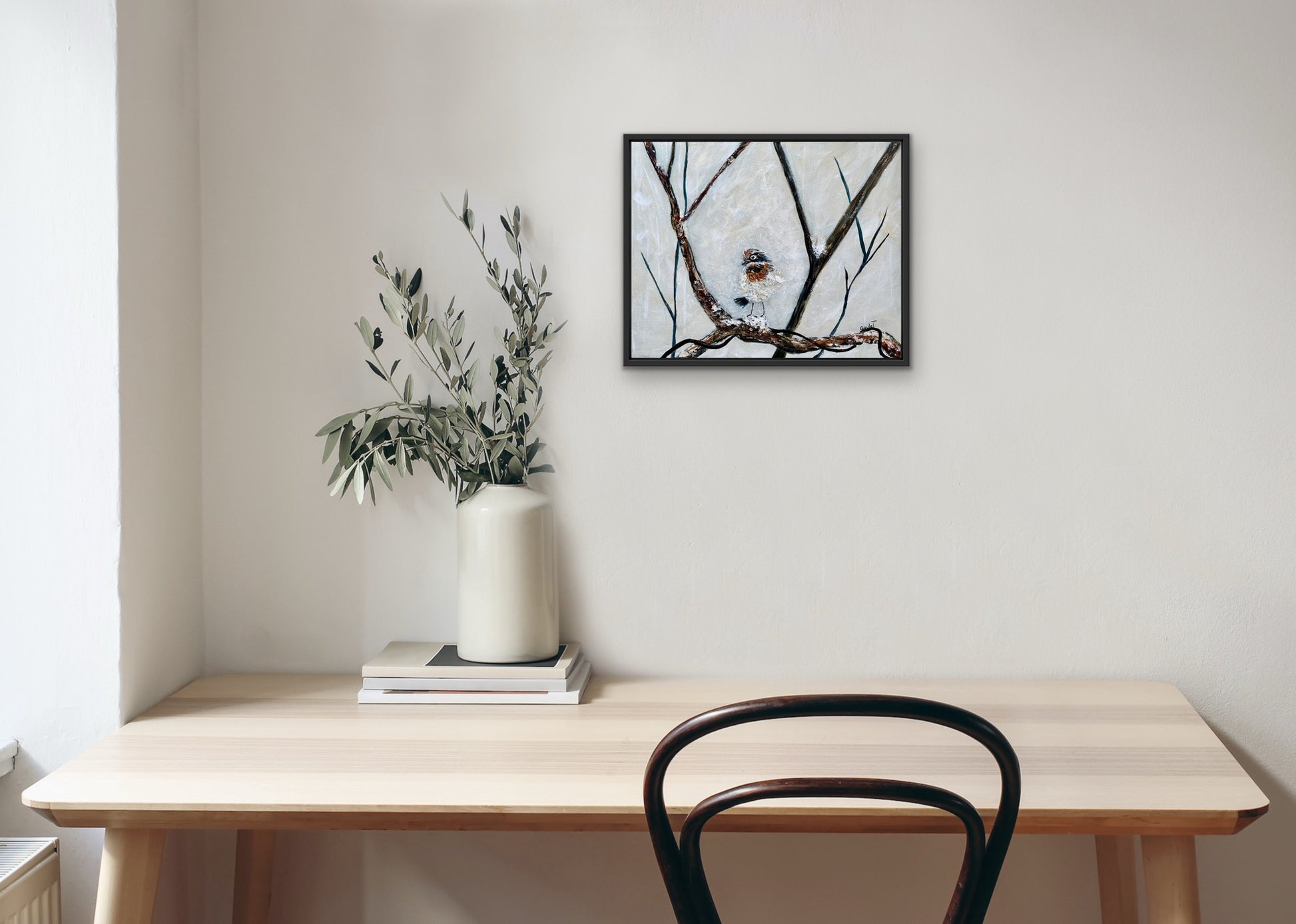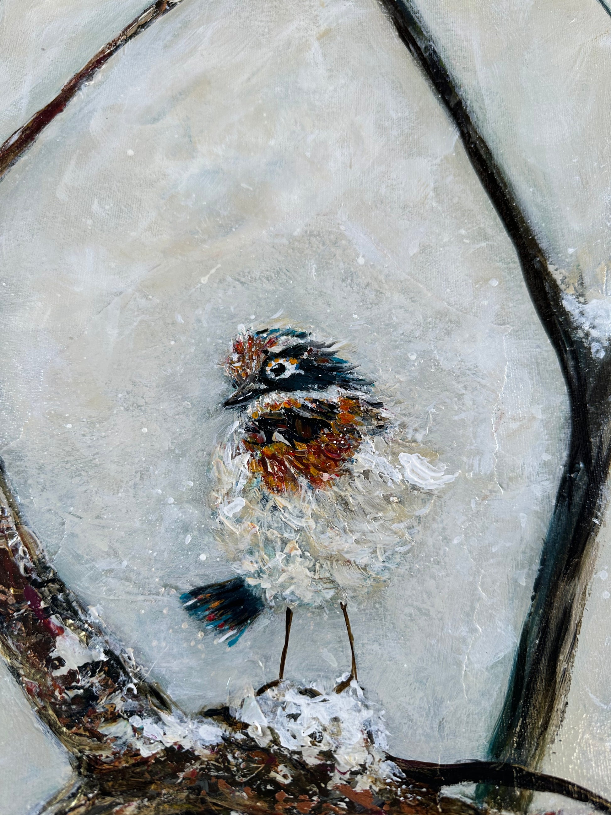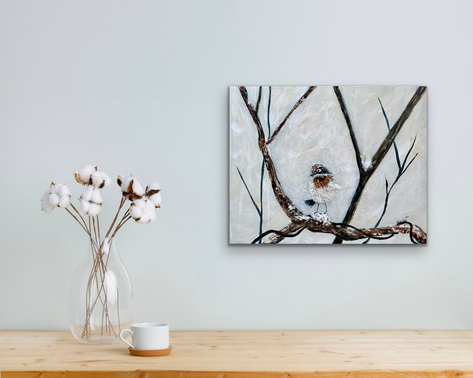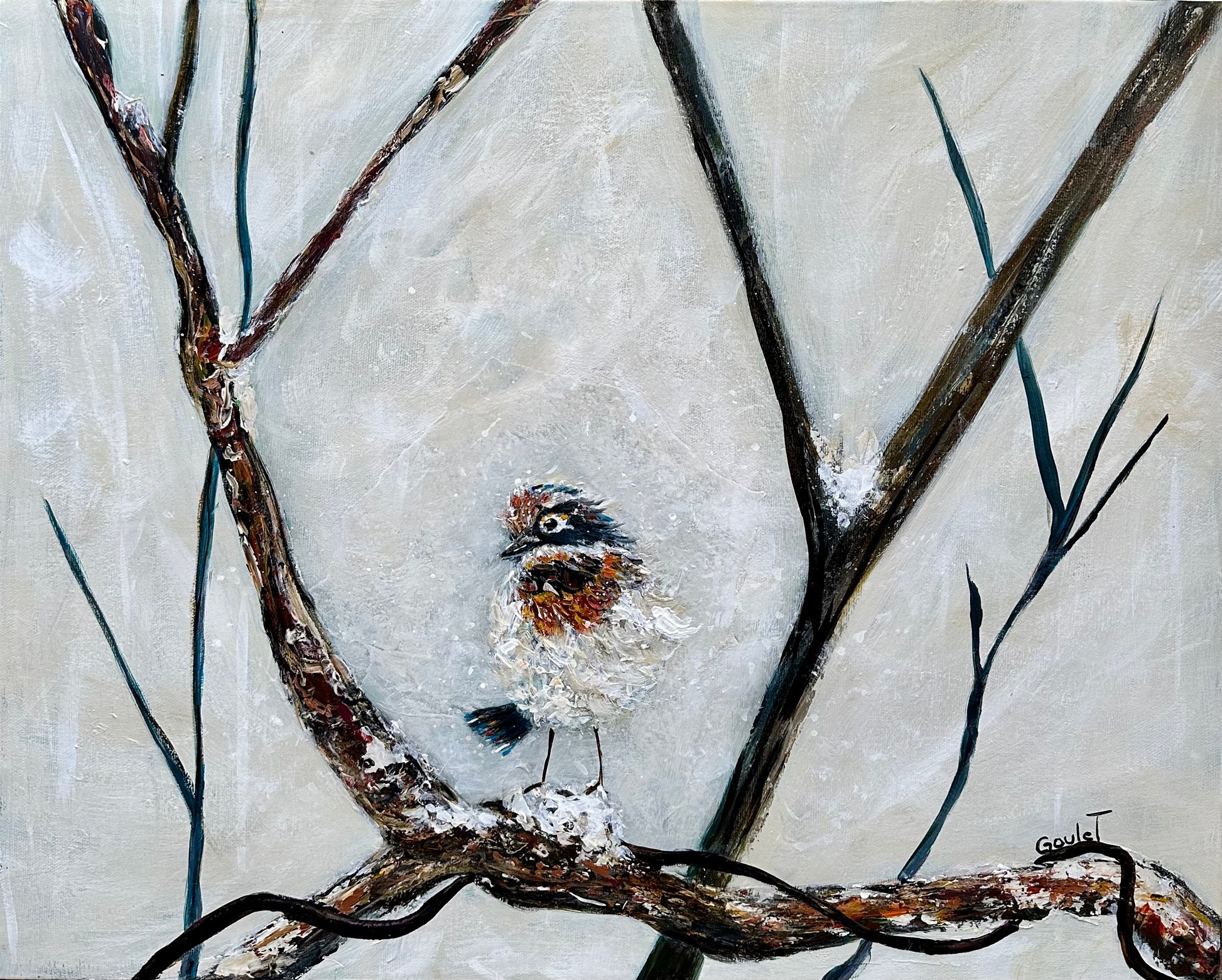 Shake it off montre un petit oiseau ébouriffé, posé sur une branche texturée,